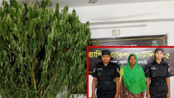 রাজশাহী চারঘাট বাড়িতে মিললো বিশাল গাঁজার গাছ, নারী গ্রেপ্তার।